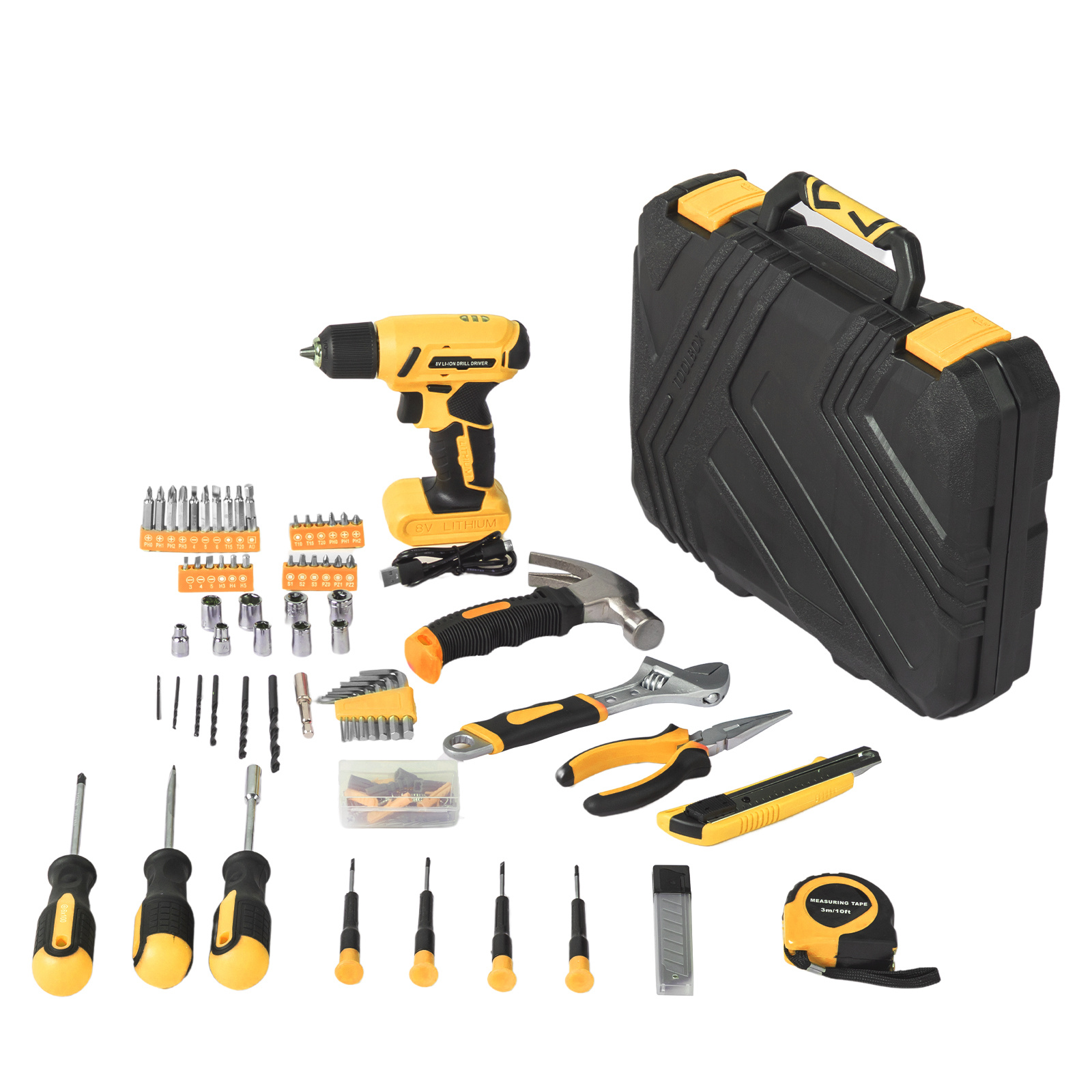 Designed for versatility and convenience, this 146-piece yellow drill and tool set is the ultimate home maintenance companion. Featuring a lightweight 8V cordless drill with built-in LED lighting and soft-grip comfort, it’s ideal for a variety of tasks like drilling, assembling furniture, or everyday repairs. The rechargeable lithium battery provides long-lasting power, and an array of hand tools and accessories, neatly stored in a durable carrying case, ensures you have everything you need right at your fingertips. Whether for home improvement or daily DIY projects, this tool kit is a practical choice for both seasoned DIYers and beginners.