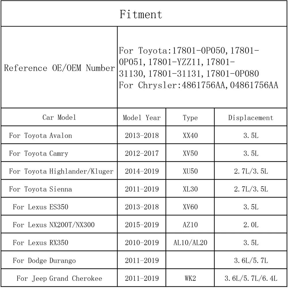 Reference OE/OEM Number: For Toyota: 17801-0P050, 17801-0P051, 17801-YZZ11, 17801-31130, 17801-31131, 17801-0P080; For Chrysler: 4861756AA, 04861756AA