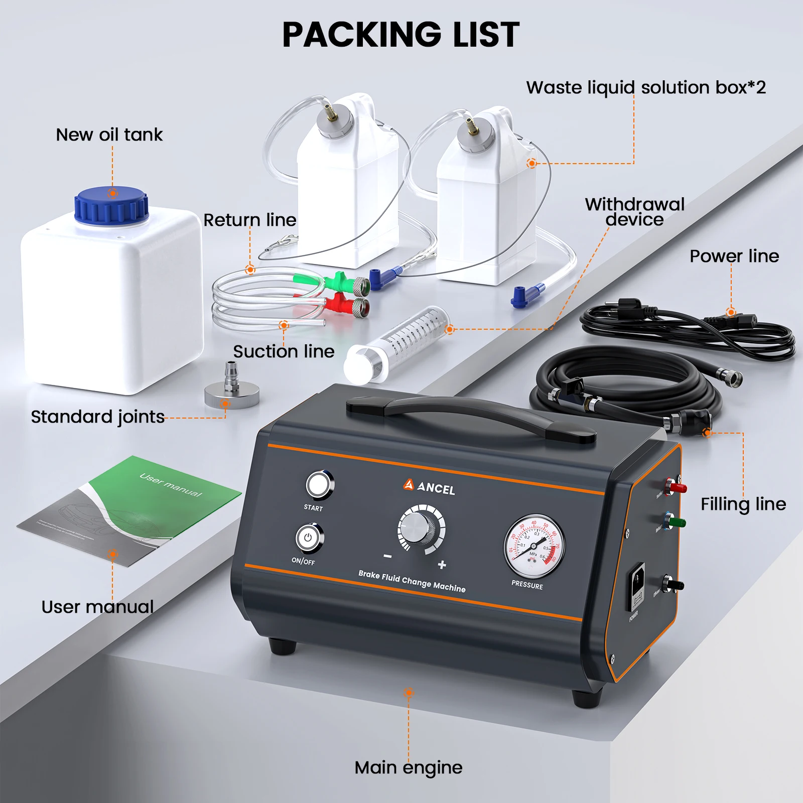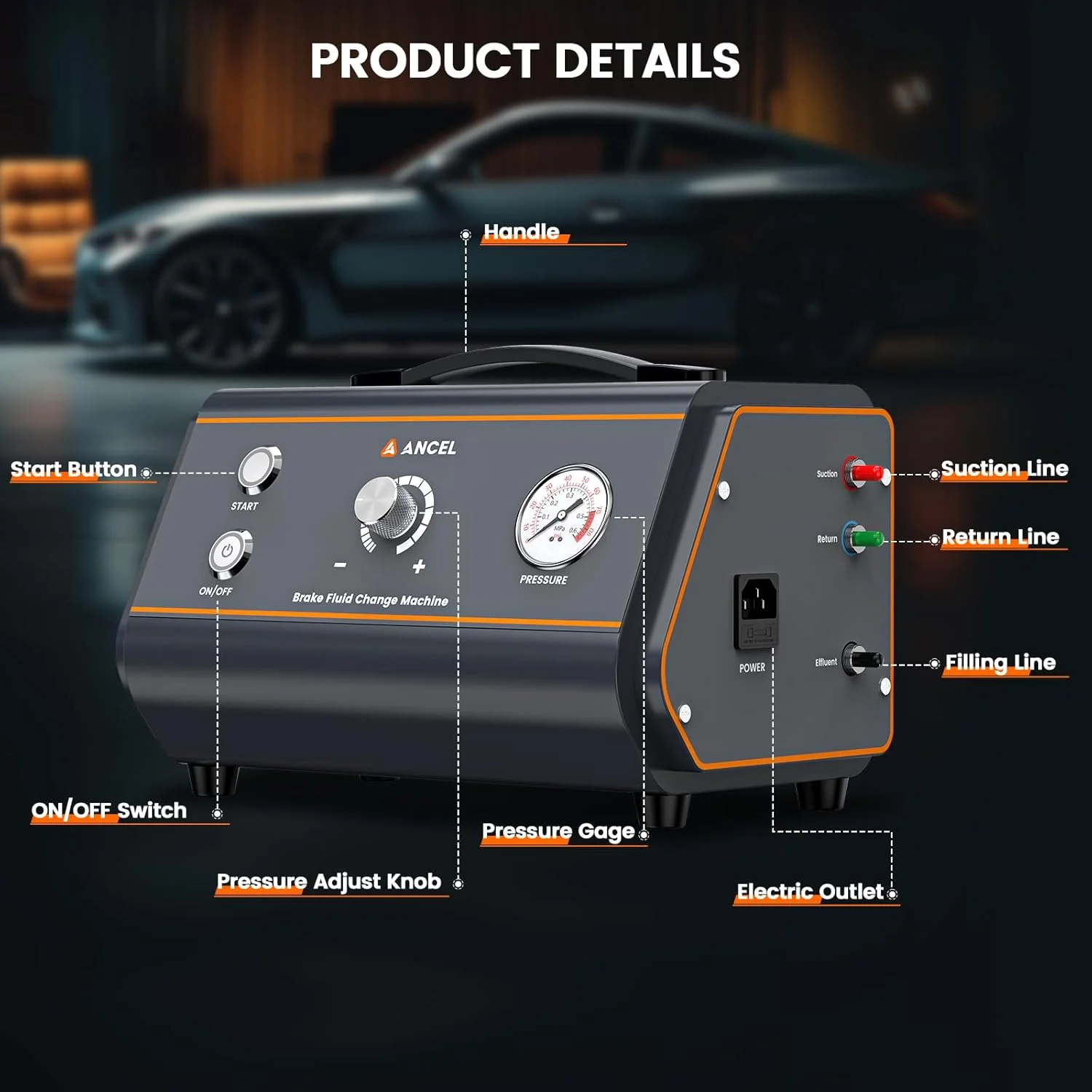 ANCEL BR1000 brake bleeder change machine is set to limit the working pressure (0.3MPa) to avoid misuse of the pressure caused by the upsurge of the potential safety hazards.