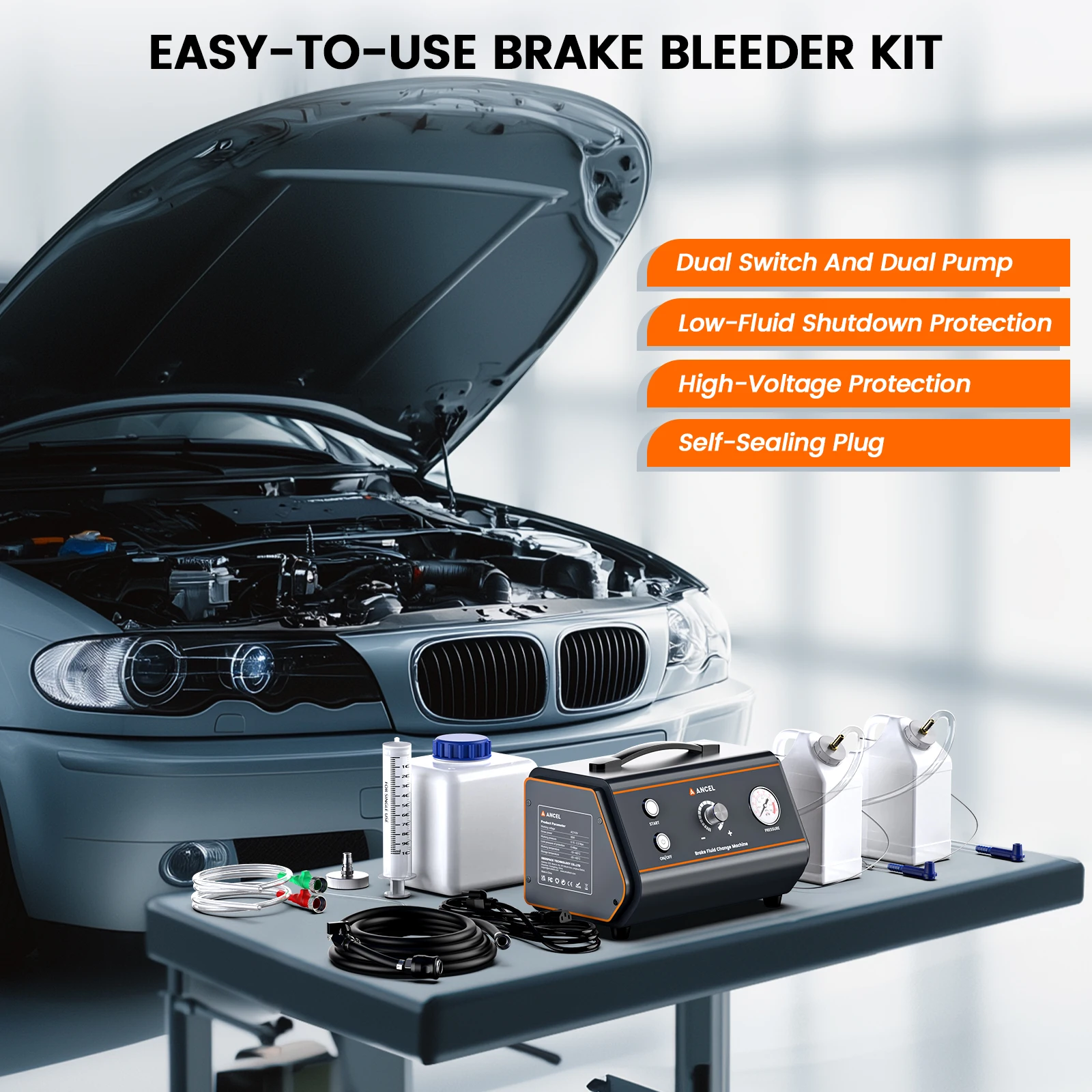 Dual Pump Design: dual pumps work at the same time to form a stable constant pressure, to avoid the pulse of a single motor to generate air into the tube, and pressure regulation is more stable, to avoid additional impact on the vehicle brake fluid jugs and the sub-pumps.