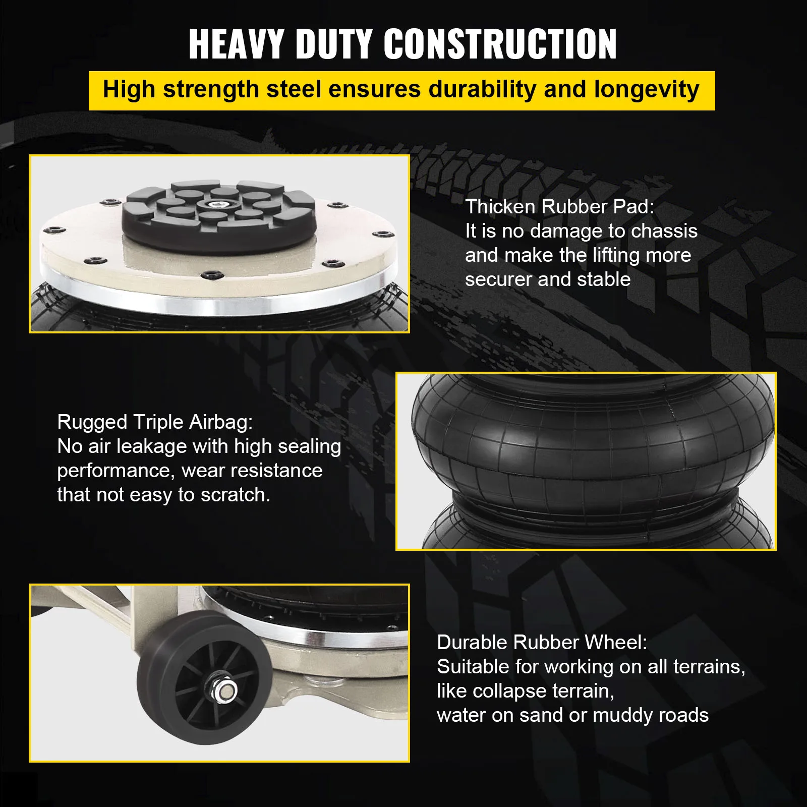 Heavy Duty Construction: Built with robust steel, this pneumatic jack is designed for durability and strength. The high-strength airbags are well-sealed to prevent leaks and resist scratches, while the all-terrain wheels ensure reliable use across different surfaces.