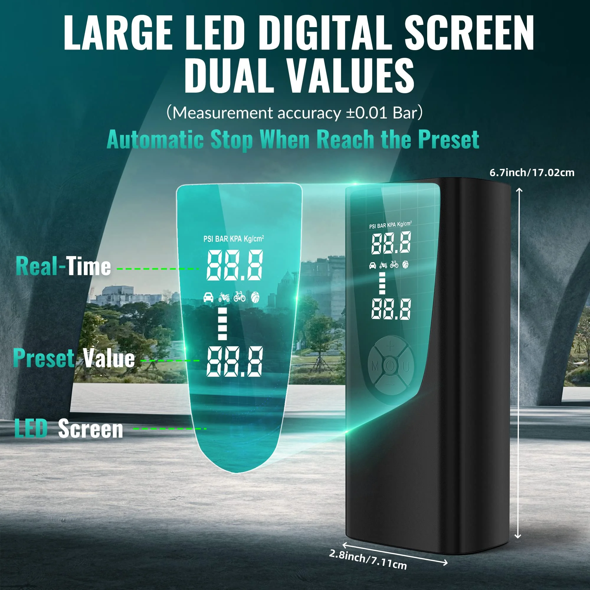 【User-Friendly 4+N Modes】It has 4 preset inflation modes: bicycle, motorcycle, car and ball; 4 pressure measurement units: PSI, KPA, BAR and kg/cm². Plug and Play, Easy to Use for first-time users. The customized mode can also set the pressure v of 3-150 PSI according to the inflatable object, and select the attached valves to meet various inflatable requirements. (NOTE: It is not designed for large volume uses like air mattresses or heavy load tires that require a small air compressor.)