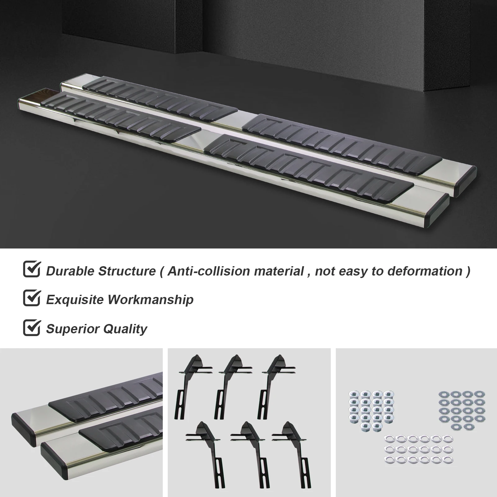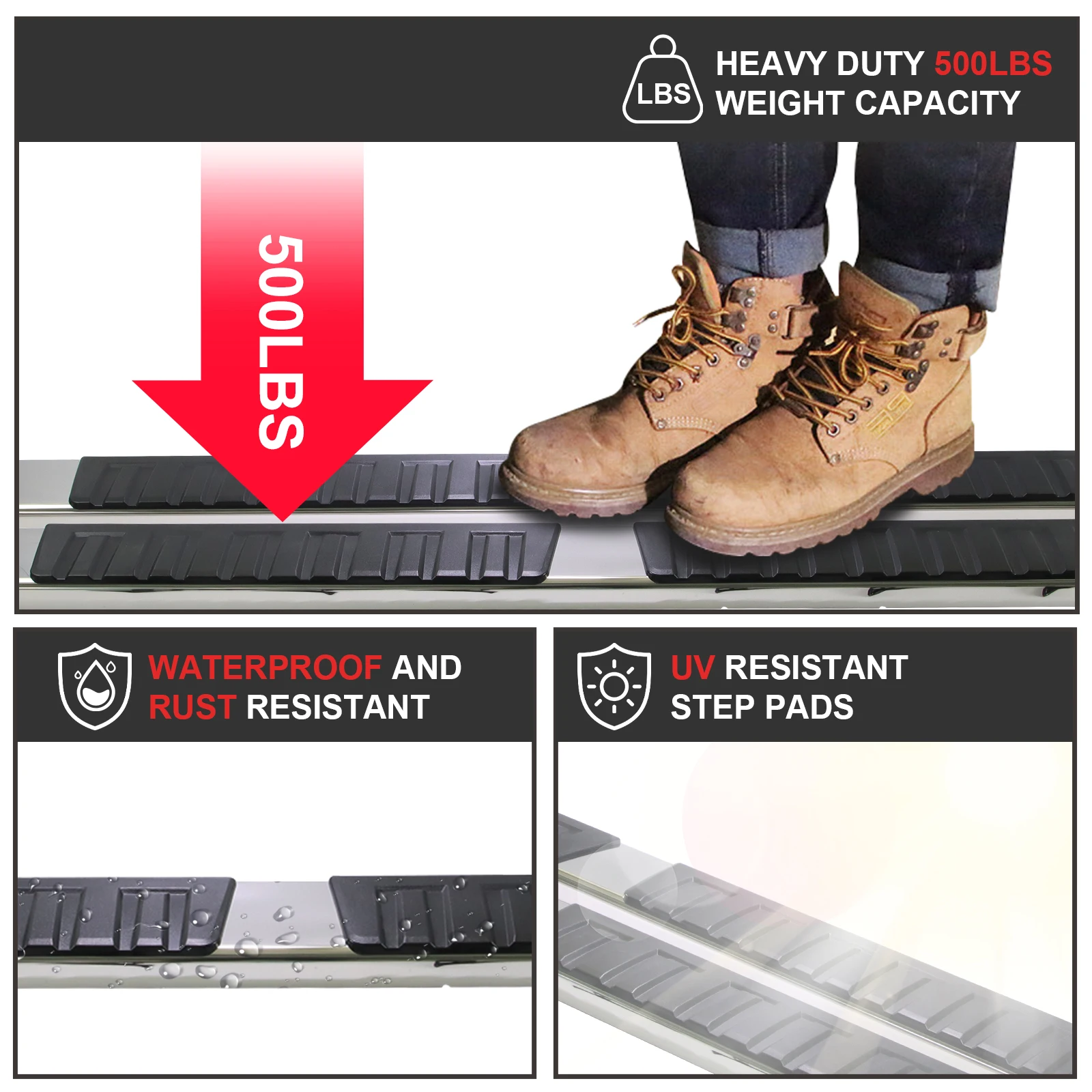 6. Running Boards & Side Steps make your life safe and simple for taking your coworkers to the job place, take your pets go out or carpooling the kids to school both. You have a very solid under foot feeling thanks to the Anti-slip tread surface and rugged construction.
